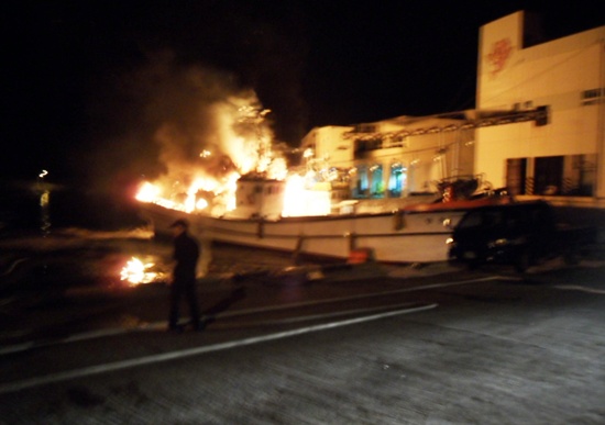 모슬포항에서 화재가 일어나 어선 2척이 불에 탔다. 하지만 현장에 출동한 경찰의 적절한 대처가 이어지면 인명피해나 추가 화재는 이어나지 않았다.