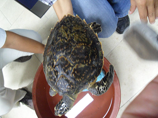 서귀포해양경찰서에 따르면 이번에 발견된 거북은 길이 33.3㎝, 폭 29.3㎝, 무게 2.8㎏인 2년 미만된 희귀보호종 매부리 바다거북으로 추정되며 발견 당시 오른족 앞발과 목에 상처가 나 있었다.