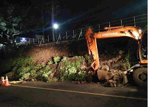 이번 사고로 흙과 돌담이 2차선 도로 중 한쪽 차선을 덮으면서 차량통행 장애가 일어났다.